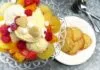 - Na to układamy pokrojone owoce w atrakcyjny sposób.